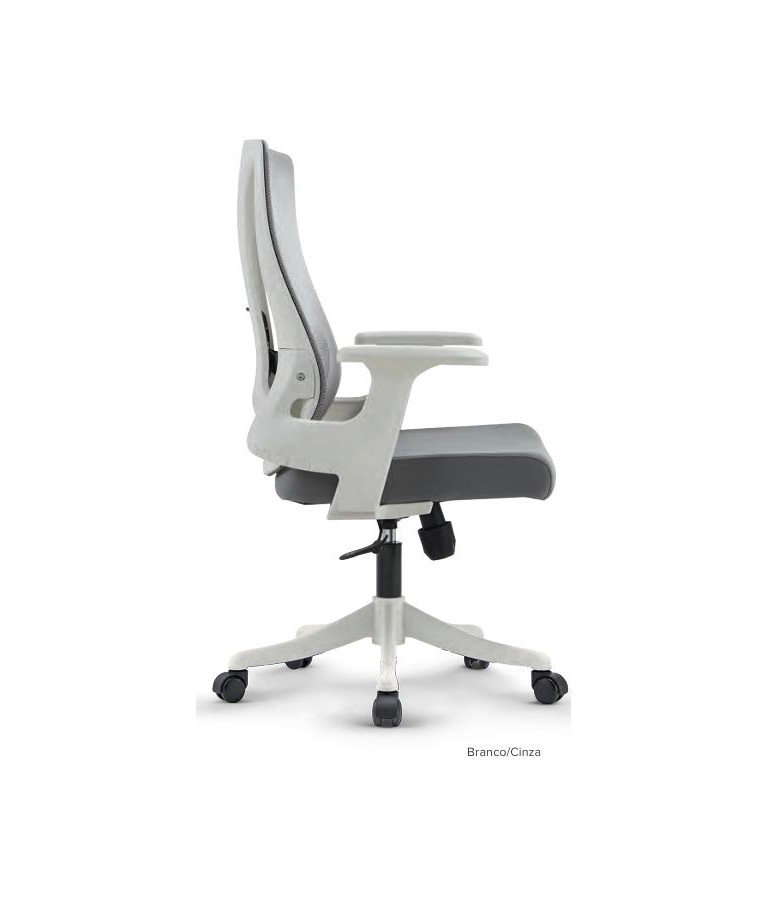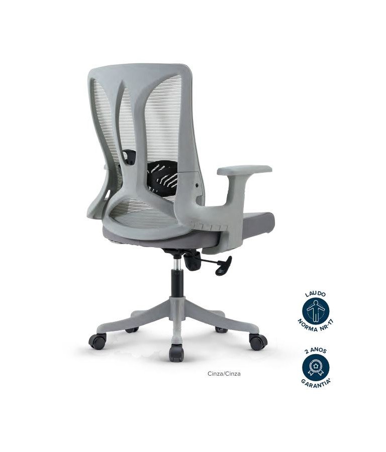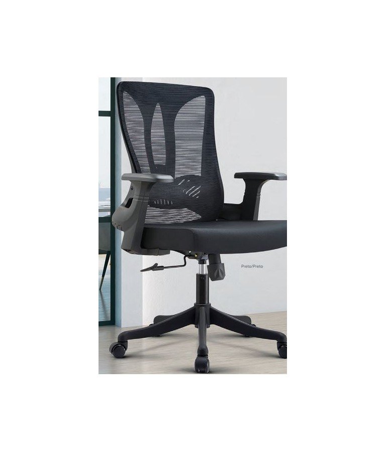 Carenagem em nylon Encosto em tela de nylon com poliéster e apoio lombar com regulagem de altura Assento revestido em tecido poliéster com espuma injetada Braço fixo em nylon Mecanismo relax com trava Pistão preto classe 3 Aranha 310 mm em nylon Rodízios nylon.